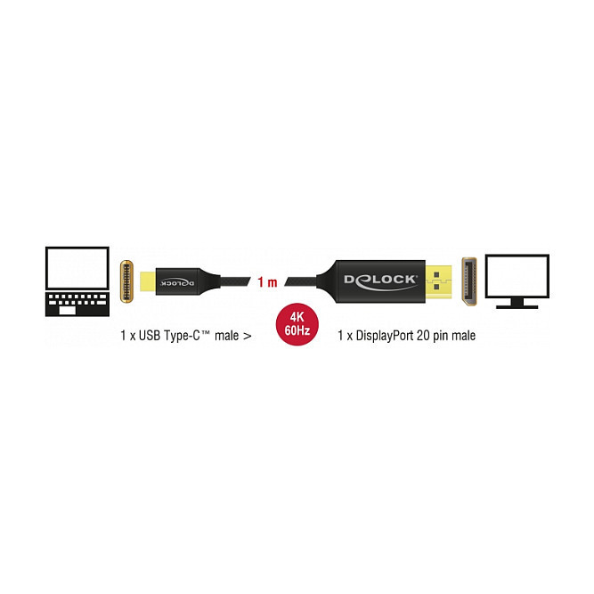 "DeLOCK 83709. Maximum resolution: 3840 x 2160 pixels, Chipset: Atmel. Product colour: Black"\n"This cable by Delock enables the connection of a DisplayPort monitor to a device with USB-C or Thunderbolt 3 port, such as a MacBook or a Chromebook. The interface has to support the DisplayPort Alternate Mode. The coaxial cable is very flexible and easy to handle due to its small diameter."