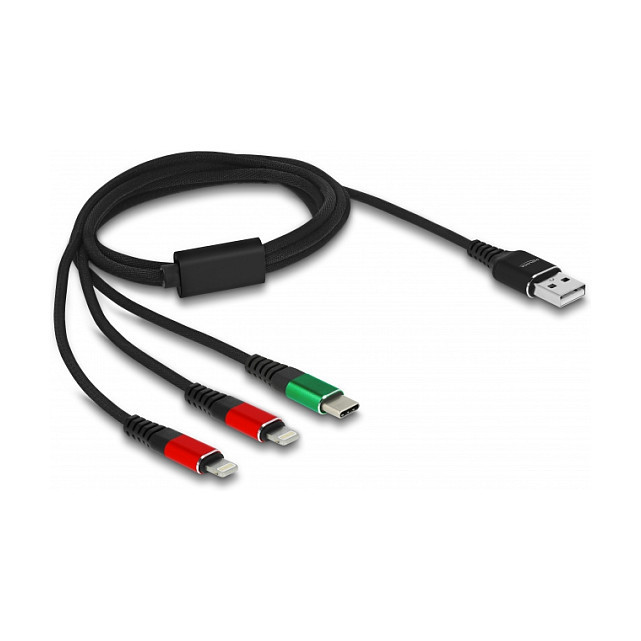 "DeLOCK USB Charging Cable 3 in 1 Type-A to 2 x Lightning™ / USB Type-C™ 1 m. Cable length: 1 m. Connector 1: USB A, Connector 2: USB C/Lightning, USB version: USB 2.0, Product colour: Black, Green, Red"\n"Description