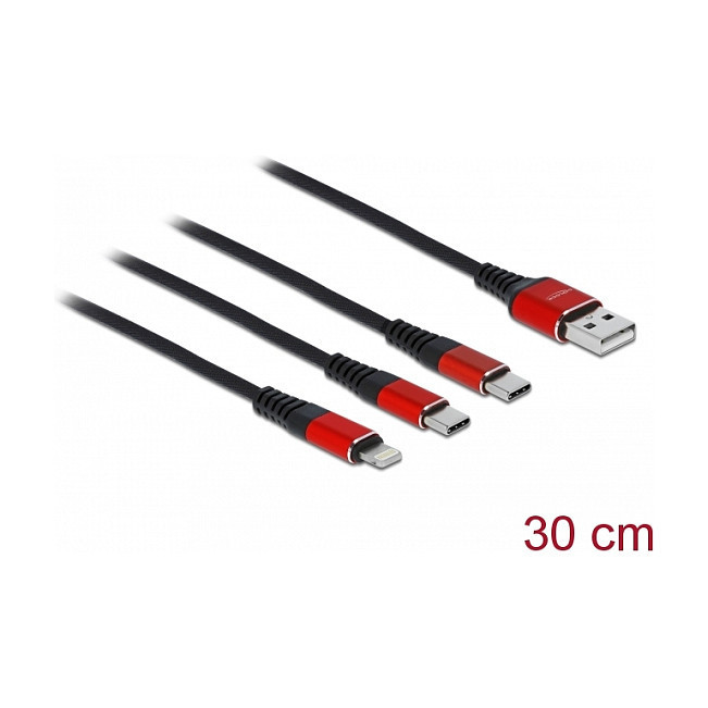 "DeLOCK USB Charging Cable 3 in 1 Type-A to Lightning / 2 x USB Type-C 30 cm black / red. Cable length: 0.3 m. Connector 1: USB A, USB version: USB 2.0, Connector contacts plating: Copper, Product colour: Black, Red"\n"This 3 in 1 charging cable by Delock can be used for charging of different devices e.g. tablets or smartphones with Lightning™ or USB Type-C™ interface through a USB power source.