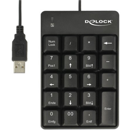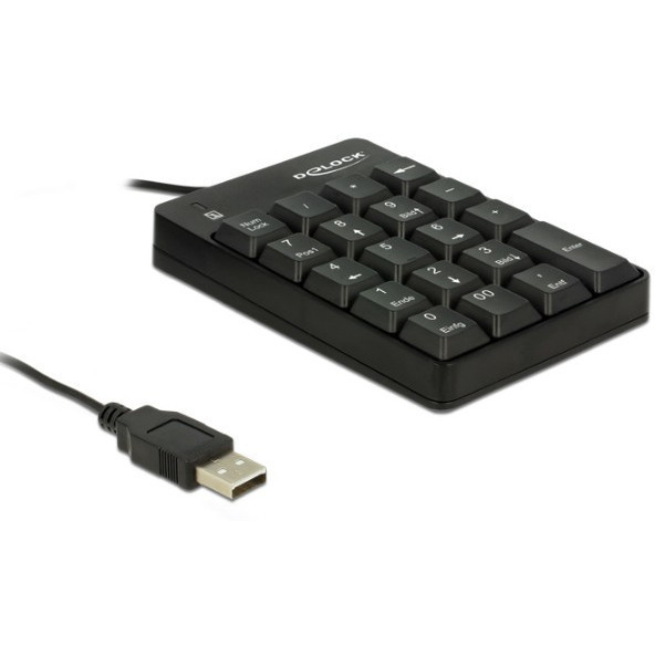 "DeLOCK 12481. Device interface: USB, Keyboard number of keys: 19, Purpose: Universal. Cable length: 1.5 m, Product colour: Black"\n"This Delock key pad can be easily connected via USB interface to a computer. It serves e.g. for the expansion of a laptop without key pad.