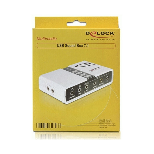 "DeLOCK USB Sound Box 7.1. Audio output channels: 7.1 channels. Host interface: USB. Cables included: USB. Compatible operating systems: Win 2000/Server-2003/XP/XP-64/Vista/Vista-64/7/7-64. Audio system maximum sampling rate: 48 kHz"\n"The USB Sound Box 7.1 by Delock expands the PC or laptop by one sound card. By outsourcing the sound processor, all disturbing influences can be minimized, so that the perfect sound is maintained. Just connect the Sound Box to a free USB port of the PC or laptop and connect the speakers or earphones to it. This product is ideal for applications like Skype, when using a headset. The result is phenomenal!"