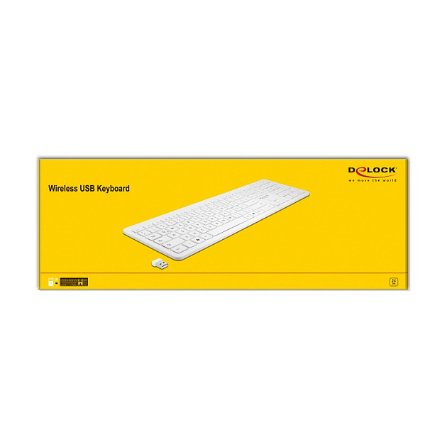 "DeLOCK 12014. Keyboard form factor: Full-size (100%). Keyboard style: Straight. Connectivity technology: Wireless, Device interface: RF Wireless, Keyboard layout: QWERTZ. Product colour: White"\n"This wireless USB keyboard by Delock with different multimedia keys, convinces with its elegant and flat design.