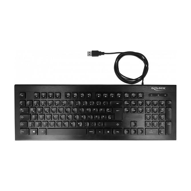 "DeLOCK 12672. Keyboard form factor: Full-size (100%). Keyboard style: Straight. Connectivity technology: Wired, Device interface: USB, Keyboard layout: QWERTZ. Cable length: 1.5 m. Recommended usage: Office. Product colour: Black"\n"This wired USB keyboard by Delock with different multimedia keys, convinces with its elegant and flat design.