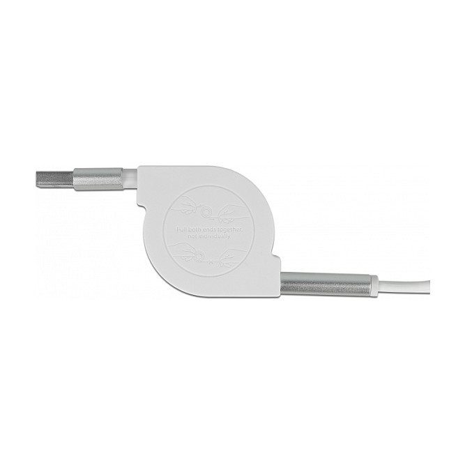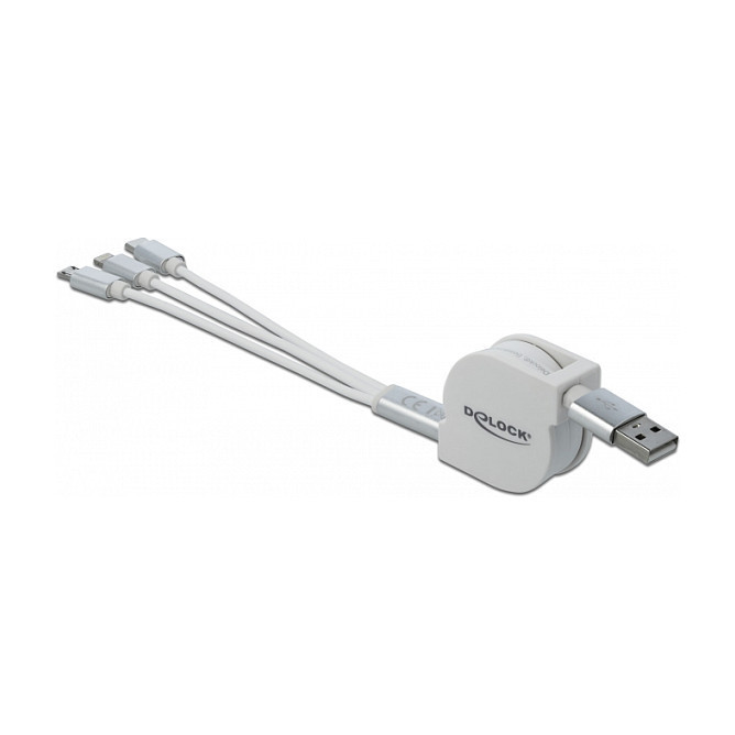 "DeLOCK 85850. Cable length: 0.98 m. Connector 1: USB A, Connector 2: USB C/Micro-USB B/Lightning, USB version: USB 2.0, Product colour: Silver, White"\n"This practical 3 in 1 retractable cable by Delock can be connected to a power source with USB-A connection and can be used to charge various devices with Lightning™, Micro USB or USB Type-C™ interface. Charging three devices at the same time is also supported, whereby the total output current of 2 A is then distributed over all lines.