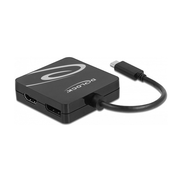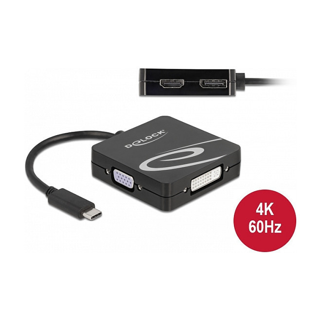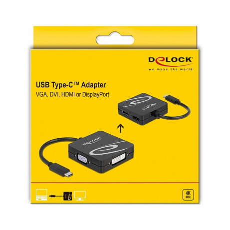 "DeLOCK USB Type-C adapter for a VGA, DVI, HDMI or DisplayPort monitor. Maximum resolution: 3840 x 2160 pixels, Supported graphics resolutions: 1920 x 1080 (HD 1080), 1920 x 1200 (WUXGA), 3840 x 2160. Product colour: Black. Windows operating systems supported: Windows 10, Windows 10 x64, Windows 8 x64, Windows 8.1, Linux operating systems supported: Linux Kernel 5.8, Other operating systems supported: Android. Country of origin: China"\n"This adapter by Delock is a perfect companion when travelling or for presentations due to its four different video ports. A VGA, DVI, HDMI or DisplayPort monitor can be connected to a computer with USB-C interface and DisplayPort alternate mode support. In addition, the adapter can also be operated on a Thunderbolt 3 interface. Only one monitor can be used on the adapter."