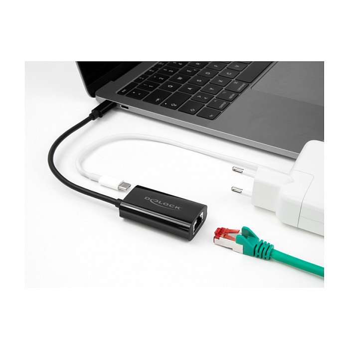 "DeLOCK USB Type-C Adapter to Gigabit LAN with Power Delivery 100 watt. Connector 1: USB C, Connector 2: RJ45, Cable length: 0.17 m. Product colour: Black"\n"The adapter by Delock expands a PC or laptop by one network interface via the USB Type-C™ interface. In addition, the adapter can also be operated on a Thunderbolt™ 3 interface.