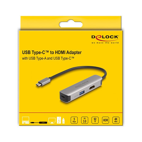 "DeLOCK USB Type-C Adapter to HDMI 4K 60 Hz with USB Type-A and USB Type-C Data + PD 92 W. Host interface: USB 3.2 Gen 1 (3.1 Gen 1) Type-C, Hub interfaces: HDMI, USB 3.2 Gen 1 (3.1 Gen 1) Type-A, USB 3.2 Gen 1 (3.1 Gen 1) Type-C. Data transfer rate: 5000 Mbit/s, Maximum refresh rate: 60 Hz, Supported graphics resolutions: 3840 x 2160. Power supply type: USB. Windows operating systems supported: Windows 10, Windows 10 x64, Windows 11, Other operating systems supported: Android, ChromeOS. Quantity per pack: 1 pc(s), Package type: Box"\n"This adapter by Delock is suitable for the connection of a HDMI monitor to a computer with USB-C™ interface and DisplayPort alternate mode support. Thus, the adapter can be connected to different laptops like MacBook, Chromebook and similar. In addition, the adapter can also be operated on a Thunderbolt™ 3 or Thunderbolt™ 4 interface.