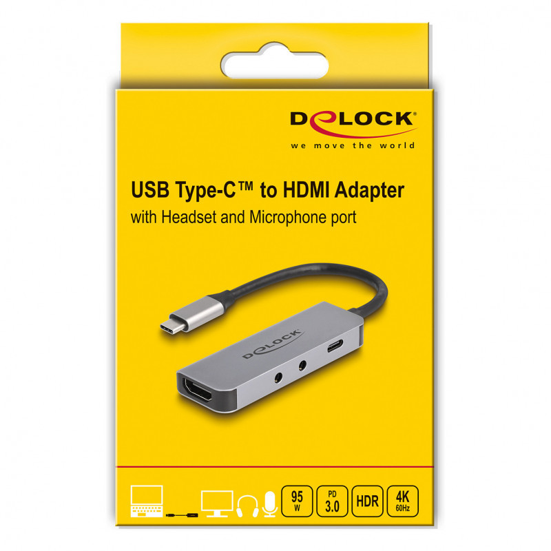 "DeLOCK 61064. Host interface: USB 3.2 Gen 1 (3.1 Gen 1) Type-C, Hub interfaces: 3.5mm, HDMI, USB 3.2 Gen 1 (3.1 Gen 1) Type-C. Maximum refresh rate: 60 Hz, Supported graphics resolutions: 3840 x 2160, Maximum resolution (HDMI): 3840 x 2160 pixels. Power supply type: USB. Windows operating systems supported: Windows 10, Windows 10 x64, Windows 11, Mac operating systems supported: Mac OS X 13.0 Ventura, Mac OS X 14.0 Sonoma, Linux operating systems supported: Linux Kernel 6.2. Quantity per pack: 1 pc(s), Package type: Box"\n"This adapter by Delock is suitable for the connection of a HDMI monitor to a computer with USB-C™ interface and DisplayPort alternate mode support. Thus, the adapter can be connected to different laptops like MacBook, Chromebook and similar. In addition, the adapter can also be operated on a Thunderbolt™ 3 or Thunderbolt™ 4 interface.