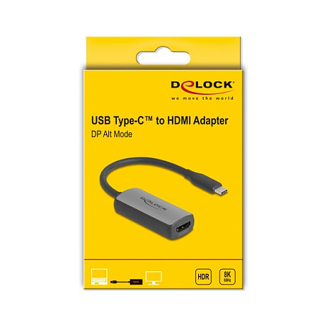 "DeLOCK 64264. Cable length: 0.17 m, Connector 1: USB Type-C, Connector 2: HDMI. Package type: Hanging box. Quantity per pack: 1 pc(s). Material: Aluminium"\n"This adapter by Delock is suitable for the connection of a HDMI monitor in 8K Ultra HD (7680 x 4320 @ 60 Hz) resolution to a computer with USB-C™ interface and DisplayPort alternate mode support. Thus, the adapter can be connected to different laptops like MacBook, Chromebook and similar. In addition, the adapter can also be operated on a Thunderbolt™ 3 or Thunderbolt™ 4 interface.