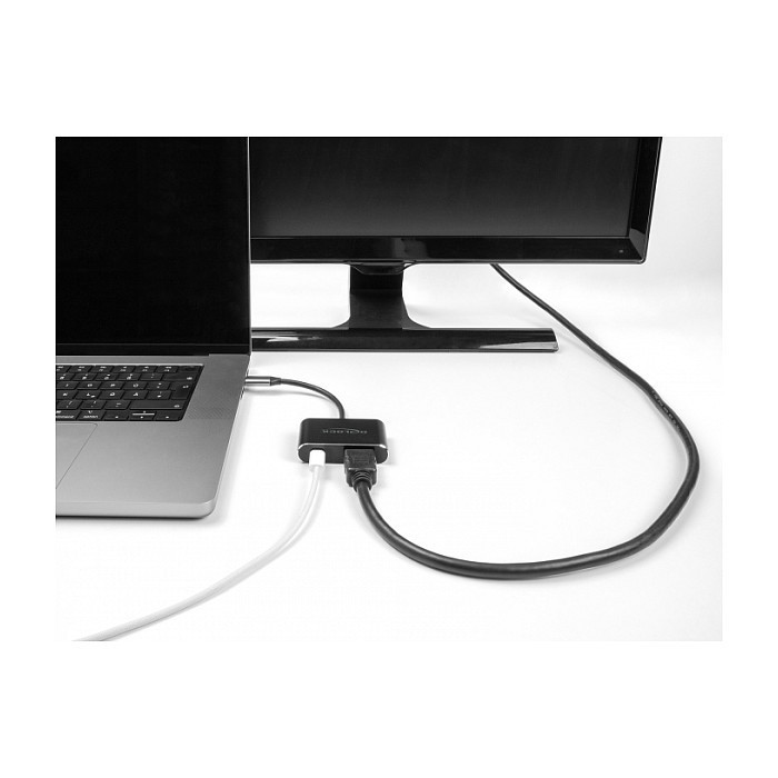 The adapter has a USB Type-C™ Power Delivery port to connect the power supply of the laptop or tablet to charge it. The adapter can also be used without a power supply."