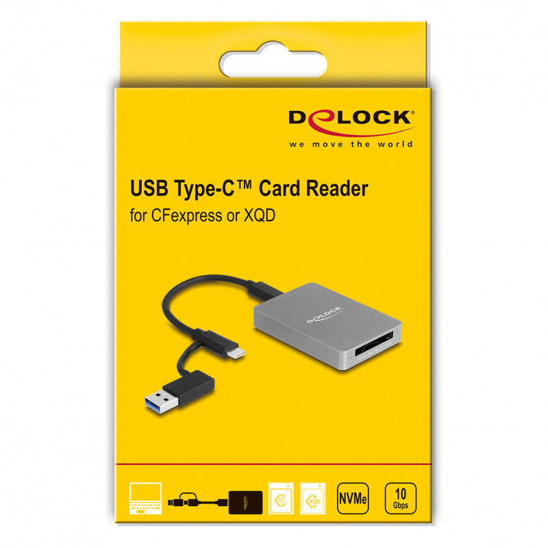 "DeLOCK USB Type-C Card Reader in aluminium enclosure for CFexpress or XQD memory cards. Compatible memory cards: CFexpress Type B, XQD, Product colour: Grey, Data transfer rate: 10000 Mbit/s. Interface: USB 3.2 Gen 1 (3.1 Gen 1) Type-C. Width: 49 mm, Depth: 71 mm, Height: 11 mm. Quantity per pack: 1 pc(s), Package type: Hanging box. Cables included: USB Type-C to USB Type-C, Interface adapters included: USB Type-C - USB Type A"\n"The card reader by Delock can be used for reading and writing XQD or CFexpress memory cards. The card reader can be connected to a PC or laptop via the USB Type-C™ or Type-A interface.