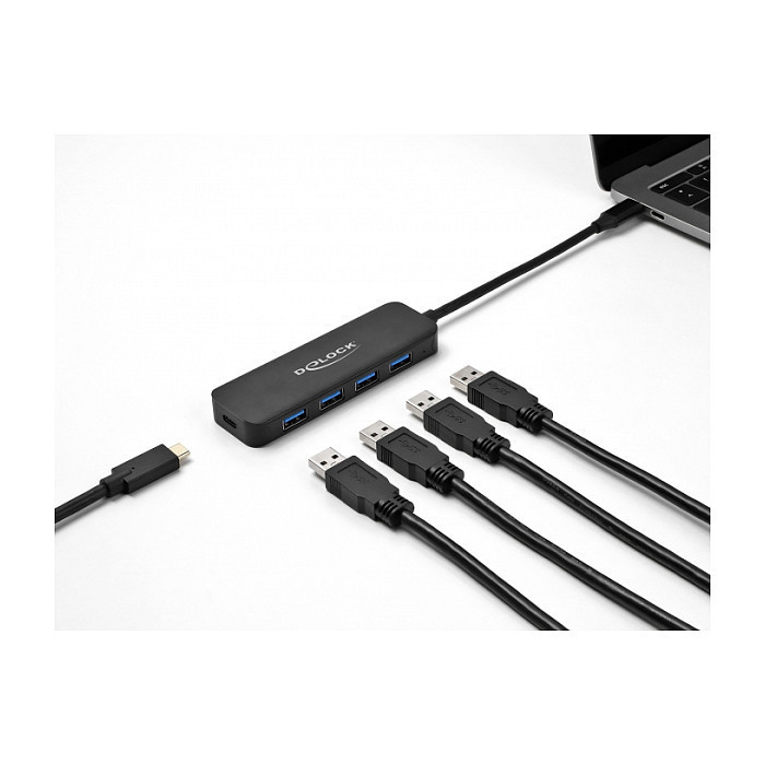 "DeLOCK USB Type-C Hub 4 Port USB 3.2 Gen 1 with Power Delivery 85 Watt. Host interface: USB 3.2 Gen 1 (3.1 Gen 1) Type-C, Hub interfaces: USB 3.2 Gen 1 (3.1 Gen 1) Type-A, USB 3.2 Gen 1 (3.1 Gen 1) Type-C. Data transfer rate: 5000 Mbit/s, Product colour: Black, Housing material: Metal. Windows operating systems supported: Windows 10, Windows 10 x64, Windows 11, Windows 8.1, Windows 8.1 x64, Linux operating systems supported: Linux Kernel 5.8, Other operating systems supported: Android. Width: 35 mm, Depth: 108 mm, Height: 13 mm"\n"This solid USB hub by Delock with metal housing can be connected by the USB Type-C interface to a computer, laptop or mobile device. Up to 4 USB Type-A devices can be connected to the hub.
