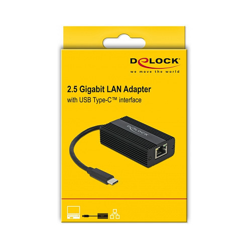 "DeLOCK 65990. Networking standards: IEEE 802.1Q, IEEE 802.3ab, IEEE 802.3bz, IEEE 802.3u, IEEE 802.3x. Product colour: Black, Data transfer rate: 2.5 Gbit/s. Width: 39.2 mm, Depth: 67 mm, Height: 21.3 mm. Quantity per pack: 1 pc(s). Cable length: 0.135 m"\n"The adapter by Delock expands a PC or laptop by one network interface via the USB Type-C™ interface. In addition, the adapter can also be operated on a Thunderbolt™ 3 interface.