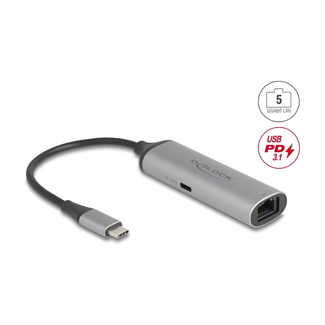 "DeLOCK 81591. Host interface: USB Type-C, Hub interfaces: RJ-45, USB Type-C. Product colour: Anthracite, Black, Housing material: Aluminium, USB Power Delivery up to: 140 W. Ethernet interface type: 2.5 Gigabit Ethernet, Fast Ethernet, Gigabit Ethernet, Ethernet LAN data rates: 10,100,1000,2500,5000 Mbit/s, Networking standards: IEEE 802.1Q, IEEE 802.3x. Power supply type: USB. Windows operating systems supported: Windows 10, Windows 11, Yes, Mac operating systems supported: Yes, Mac OS 14.5, Linux operating systems supported: Linux Kernel 6.5, Yes"\n"High speed: Data transfer rates up to 5 Gbps