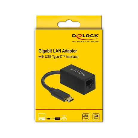 "DeLOCK Adapter SuperSpeed USB (USB 3.2 Gen 1) with USB Type-C™ male > Gigabit LAN 10/100/1000 Mbps compact black. Host interface: USB 3.2 Gen 1 (3.1 Gen 1) Type-C. Ethernet LAN data rates: 10,100,1000 Mbit/s, Networking standards: IEEE 802.3, IEEE 802.3ab, IEEE 802.3az, IEEE 802.3u. Product colour: Black, Hub interfaces: RJ-45, LED indicators: Activity, Link. Windows operating systems supported: Windows 10, Windows 10 x64, Windows 8, Windows 8.1, Windows 8.1 x64. Width: 20 mm, Depth: 40 mm, Height: 19 mm"\n"The adapter by Delock expands a PC or laptop by one network interface via the USB Type-C™ interface. In addition, the adapter can also be operated on a Thunderbolt™ 3 interface.