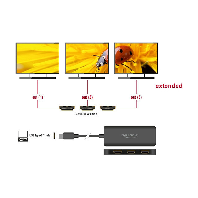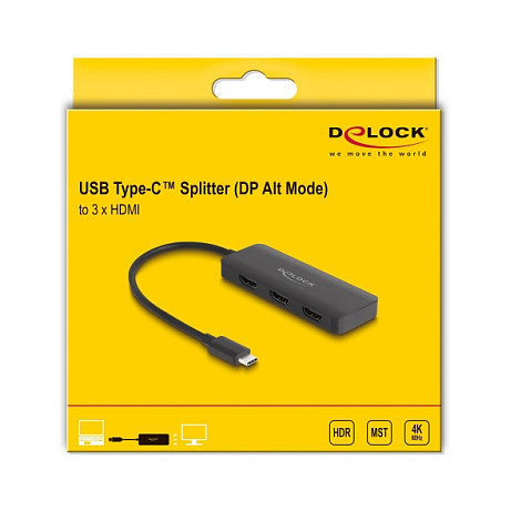 "DeLOCK USB Type-C Splitter (DP Alt Mode) to 3 x HDMI MST 4K 60 Hz. Hub interfaces: USB Type-C. Supported graphics resolutions: 3840 x 2160, Product colour: Black, HDCP version: 1.4/2.2. Windows operating systems supported: Windows 10, Windows 10 x64, Windows 11. Width: 36 mm, Depth: 98 mm, Height: 12 mm. Quantity per pack: 1 pc(s), Package type: Hanging box"\n"This splitter by Delock is suitable for the connection of three HDMI monitors to a computer with USB-C™ interface and DisplayPort alternate mode support. Three monitors can be operated simultaneously at the outputs.