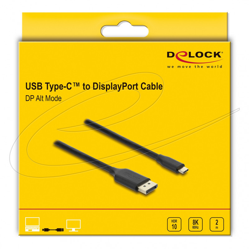 "DeLOCK 80165. Cable length: 2 m, Connector 1: USB Type-C, Connector 2: DisplayPort. Package type: Hanging box. Quantity per pack: 1 pc(s)"\n"This cable by Delock enables the connection of a DisplayPort monitor to a PC or laptop with USB-C™ or Thunderbolt™ 3 port, such as a MacBook or a Chromebook. The interface has to support the DisplayPort Alternate Mode.