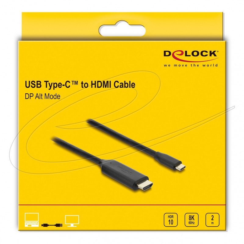 "DeLOCK 80599. Cable length: 2 m, Connector 1: USB Type-C, Connector 2: HDMI. Package type: Hanging box. Quantity per pack: 1 pc(s)"\n"This cable by Delock enables the connection of a DisplayPort monitor to a PC or laptop with USB-C™ or Thunderbolt™ 3 port, such as a MacBook or a Chromebook. The interface has to support the DisplayPort Alternate Mode."