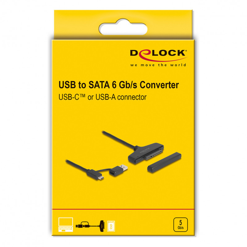 "DeLOCK USB to SATA 6 Gb/s Converter with USB Type-C or USB Type-A connector. Cable length: 0.3 m, Cable type: SATA III, Connector 1: SATA 22-pin. Quantity per pack: 1 pc(s), Package type: Box"\n"This Delock converter can be connected via USB-C™ or USB Type-A interface to a PC or laptop. Thus a 2.5″ SATA HDD or SSD with a 22 pin SATA interface can be used.