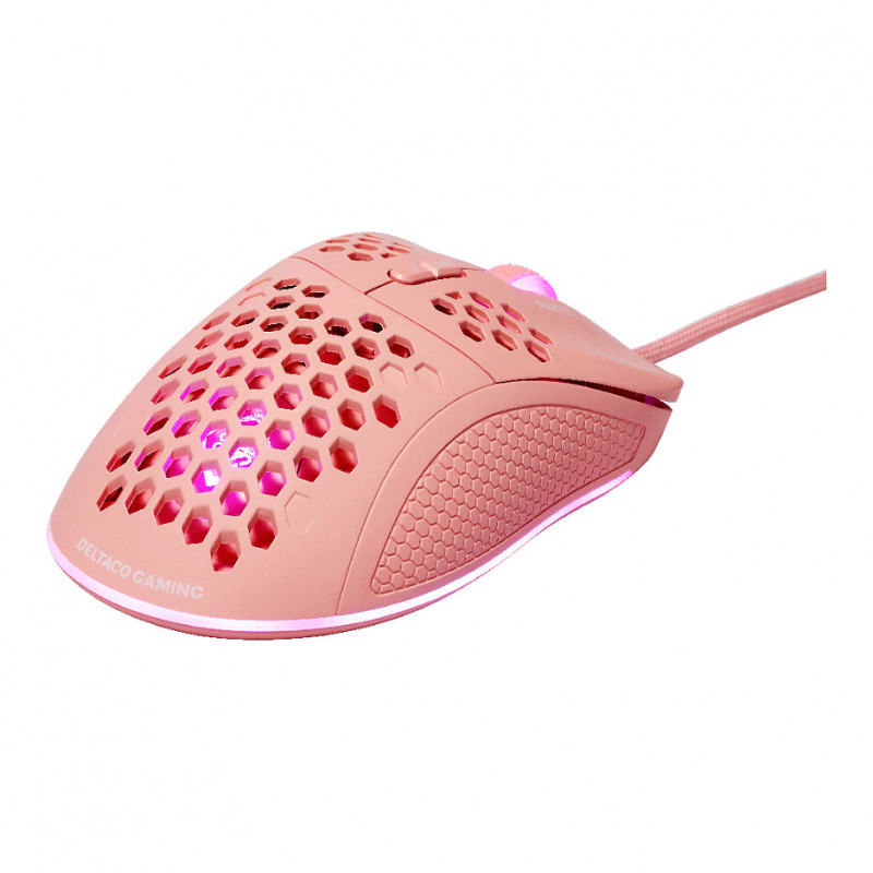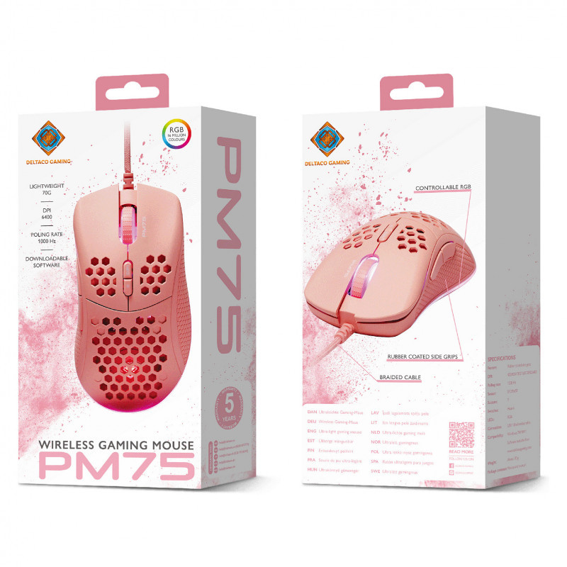 "Deltaco Gaming GAM-108-P. Connectivity technology: Wired, Device interface: USB, Keyboard number of keys: 7. Backlight type: RGB LED. Cable length: 1.8 m. Product colour: Pink"\n"Our first ultralight gaming mouse from our pink line PM75 gives you everything you need in a gaming mouse. Amazing RGB, ultra light weight and rubber coated side grips for that ultra control even in pressured situations. The 6 different DPI modes can be alternated via the top button while the button below helps with LED lighting.