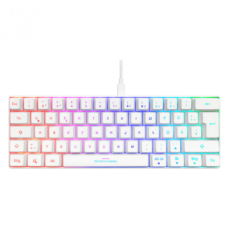 "Deltaco Gaming GAM-075-W-DE. Keyboard form factor: 60%. Keyboard style: Straight. Connectivity technology: Wired, Device interface: USB, Keyboard key switch: Mechanical, Keyboard layout: QWERTZ, Keyboard number of keys: 62. Backlight type: RGB LED. Cable length: 1.8 m. Recommended usage: Gaming. Product colour: White"\n"DELTACO GAMING WK85B mechanical keyboard in 60% layout, RGB, red switches, German Layout white