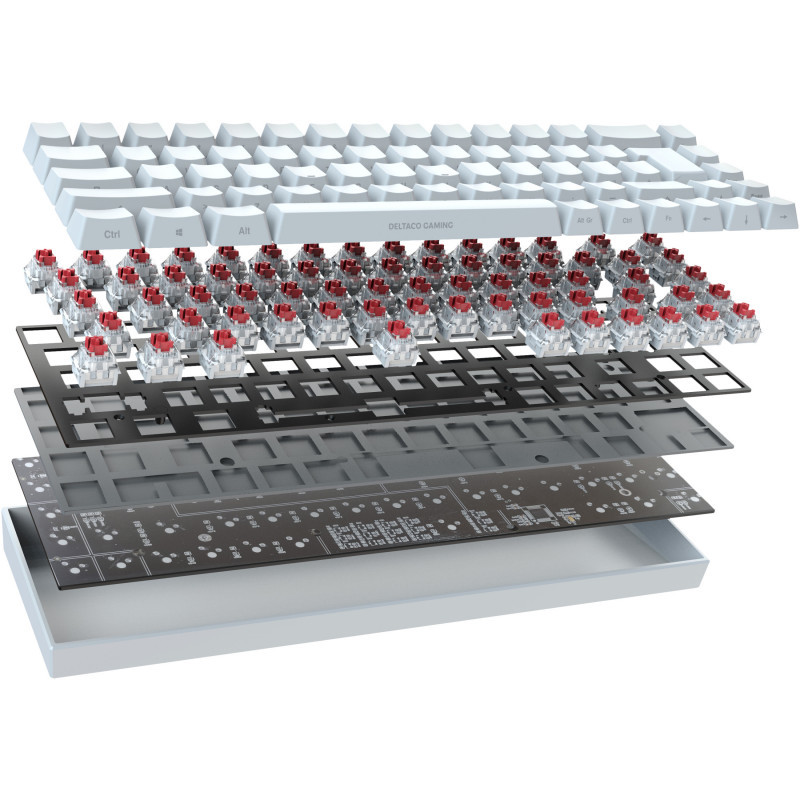 "Deltaco Gaming GAM-100-W-DE. Keyboard form factor: 65%. Keyboard style: Straight. Connectivity technology: Wired & Wireless, Device interface: USB + RF Wireless + Bluetooth, Keyboard key switch: Mechanical, Keyboard layout: QWERTZ, Keyboard number of keys: 68. Backlight type: RGB LED. Cable length: 1.8 m. Recommended usage: Gaming. Product colour: White"\n"DELTACO GAMING WK95R Wireless 65% keyboard, front lasered keys, RGB, Kailh Red, N-key rollover, German Layout, white/RGB