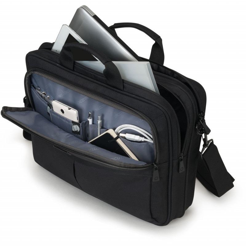"DICOTA Top Traveller. Case type: Messenger case, Maximum screen size: 39.6 cm (15.6""), Number of front pockets: 1, Shoulder strap. Weight: 930 g. Surface coloration: Monochromatic"\n"Lived sustainability with a clear conscience – SCALE’s family of products are manufactured from recycled PET and are kind to the environment. Consistent recycling helps to conserve resources. At DICOTA, it’s the foundation of our innovative solutions. Top Traveller SCALE is the intelligent toploader solution with plenty of storage space. The bag offers excellent protection for your devices and is comfortable and easy to carry. Designed for daily use. Equipped with practical functions that make your life easier.