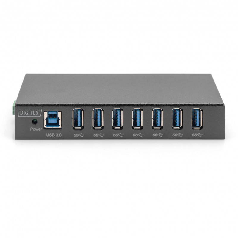 "Digitus USB 3.0 Hub 7-Port, Industrial Line. Host interface: USB 3.2 Gen 1 (3.1 Gen 1) Type-B, Hub interfaces: USB 3.2 Gen 1 (3.1 Gen 1) Type-A. Data transfer rate: 5000 Mbit/s, Product colour: Black, Housing material: Metal. Power supply type: DC, Power consumption (max): 31.5 W, Input voltage: 9 - 24 V. Width: 69 mm, Depth: 139 mm, Height: 25 mm. Quantity per pack: 1 pc(s), Package width: 210 mm, Package depth: 184 mm"\n"Expands a computer with USB A port with 4 additional USB A super-speed ports.