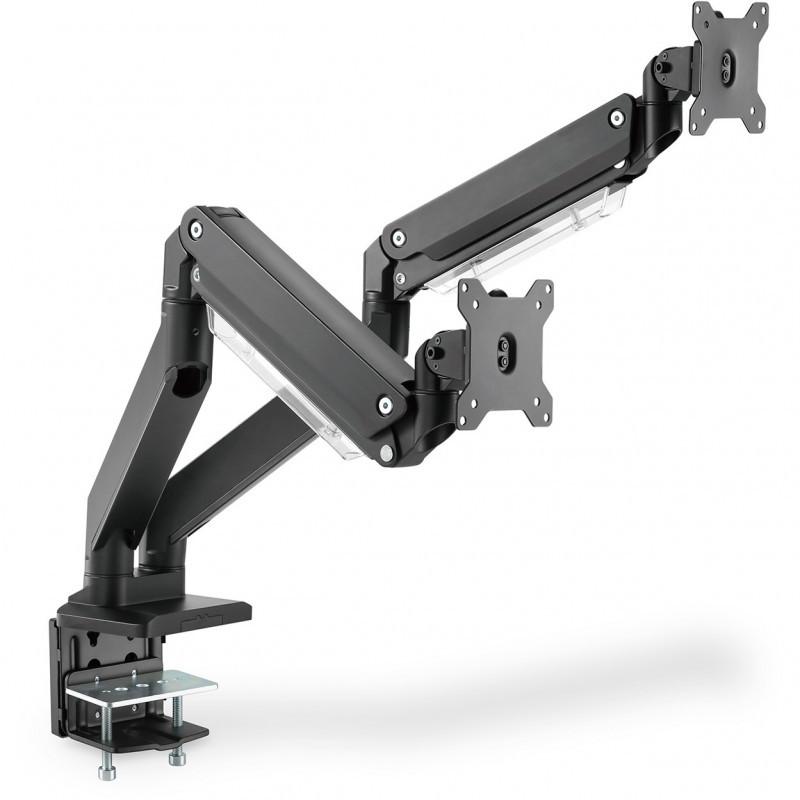 "Digitus Dual monitor mount, 2x 35"", 2x 15 kg. Maximum weight capacity: 15 kg, Minimum screen size: 38.1 cm (15""), Maximum screen size: 88.9 cm (35""), Minimum VESA mount: 75 x 75 mm, Maximum VESA mount: 100 x 100 mm. Tilt angle range: -45 - 45°, Swivel angle range: -90 - 90°, Angle of rotation: 360°. Product colour: Black"\n"The desktop mount offers you the option of individually aligning monitors up to 35"". The monitor can be swiveled, tilted and rotated. The integrated gas pressure spring makes height adjustment easy. With quick-release function.