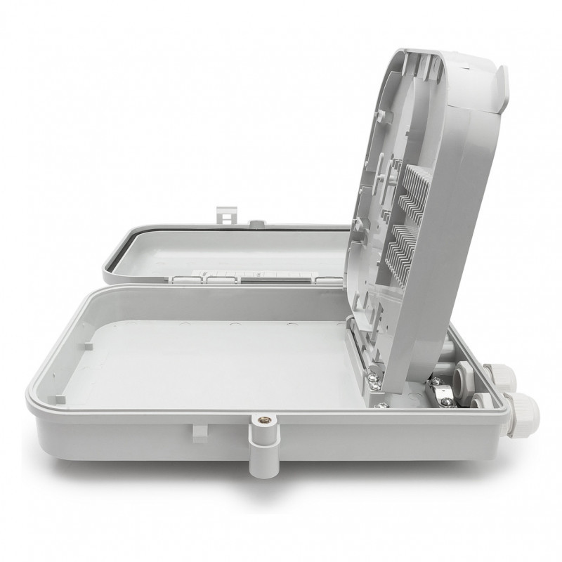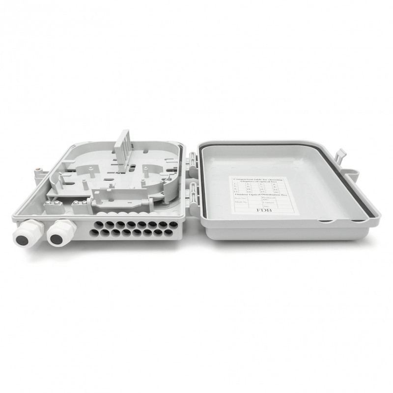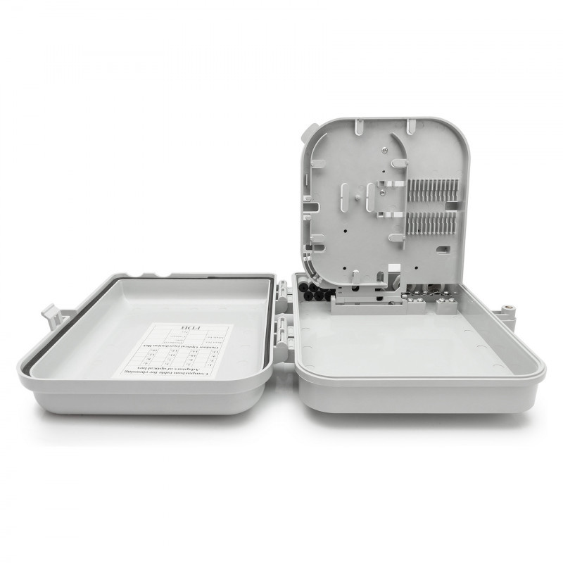 "Digitus FTTH Distribution Box for 16 LC/DX or SC/SX couplers. Connector type: LC/SC, Product colour: Grey. Width: 250 mm, Depth: 300 mm, Height: 80 mm. Quantity per pack: 1 pc(s). Country of origin: China"\n"The FTTH box is suitable for outdoor installation. An internal holder for 16x LC (DX) or SC (SX) couplers is used for fiber optic distribution. An overlength tray for pigtails and various cable inlets ensure the best possible cabling options."