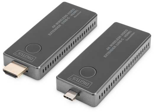 "Digitus 4K Video Extender (USB-C - HDMI), 30 m. Type: AV transmitter & receiver, Cable types supported: Cat6, Maximum transfer distance: 30 m. Connectivity technology: Wired, USB version: 3.2 Gen 1 (3.1 Gen 1), USB connector type: USB Type-C. Power consumption (transmitter) (max): 5 W. Receiver dimensions (WxDxH): 34 x 72 x 15 mm, Receiver weight: 36 g, Transmitter dimensions (WxDxH): 34 x 93 x 15 mm. Quantity per pack: 1 pc(s), Package width: 131 mm, Package depth: 166 mm"\n"Extends USB-C AV signals (4K/120Hz, 4:4:4) over a distance of up to 30 m via CAT cable for output on an HDMI display