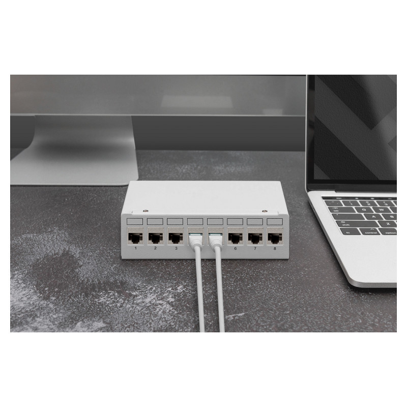 "Digitus CAT 6A Keystone module, shielded, tool-free mounting connection - 8 pcs.. Construction type: Flat, Product colour: Silver, Connector 1: RJ-45. Quantity per pack: 8 pc(s)"\n"Quick and easy installation without special tools