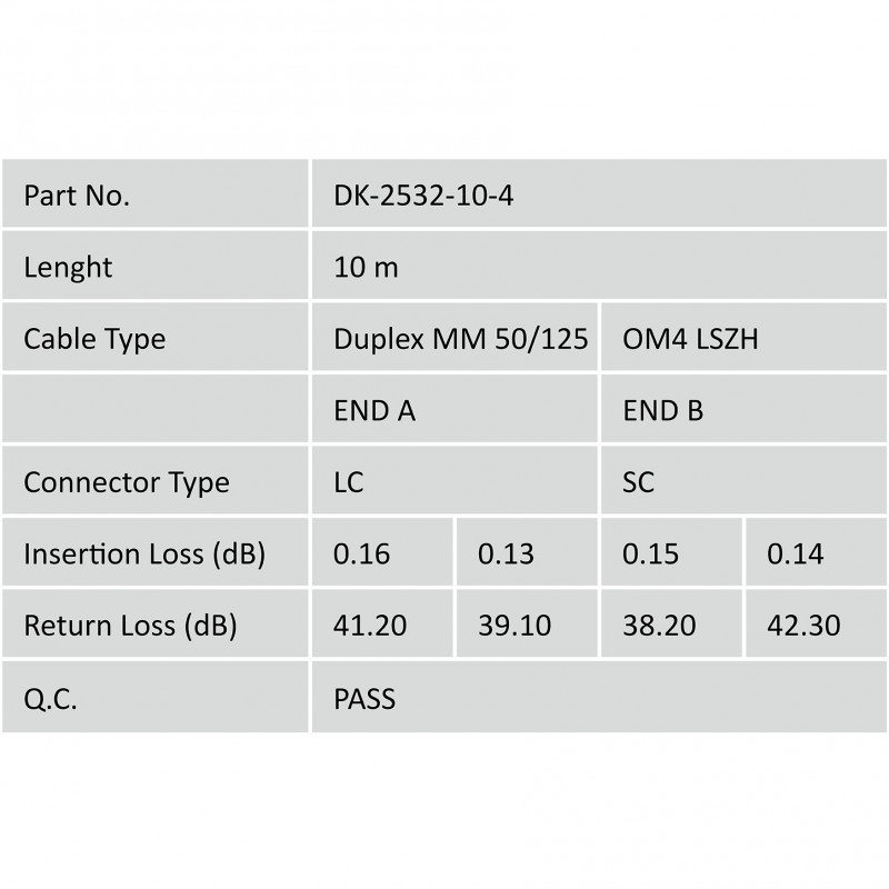"Digitus Fiber Optic Multimode Patch Cord, OM4, LC / SC. Cable length: 10 m, Cable type: I-VH, Fibre optic type: OM4, Connector 1: LC, Connector 2: SC, Core diameter: 50 µm"\n"Future-oriented standards and high-end quality for your network.