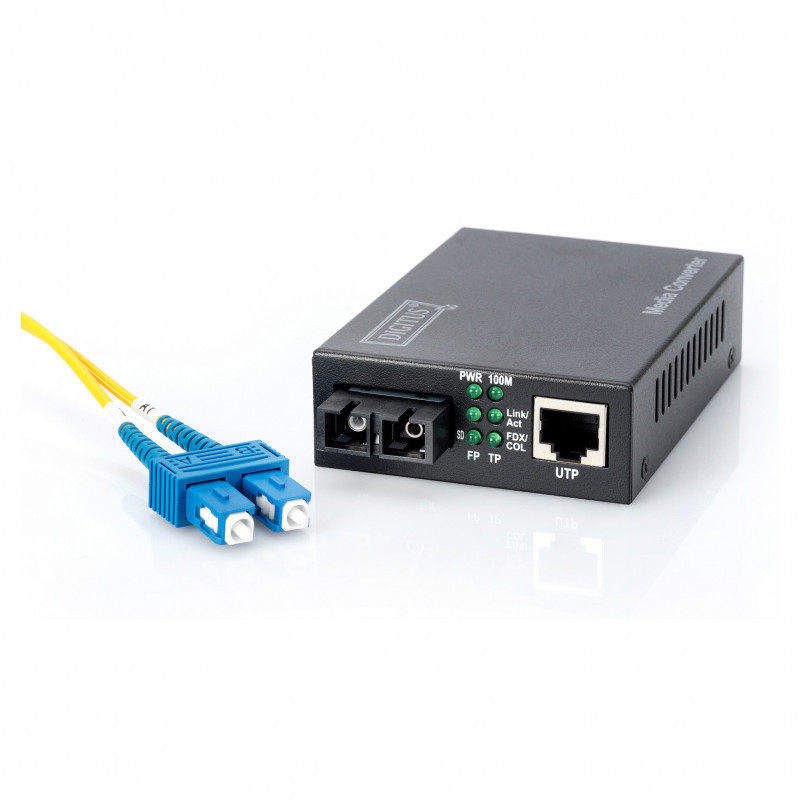 "Digitus Fast Ethernet Media Converter, RJ45 / SC. Converter input interface: 100Base-TX, Converter output interface: 100Base-FX, Networking standards: IEEE 802.3, IEEE 802.3u. Maximum transfer distance: 20000 m, Wavelength: 1310 nm, Fiber mode structure: Single-mode. LED indicators: Activity, Link, Status, Product colour: Black. Fiber optic connector: SC, Connectivity technology: Wired. Input voltage: 5 V, Power consumption (typical): 2.5 W"\n"The perfect converter solution for various fiber media