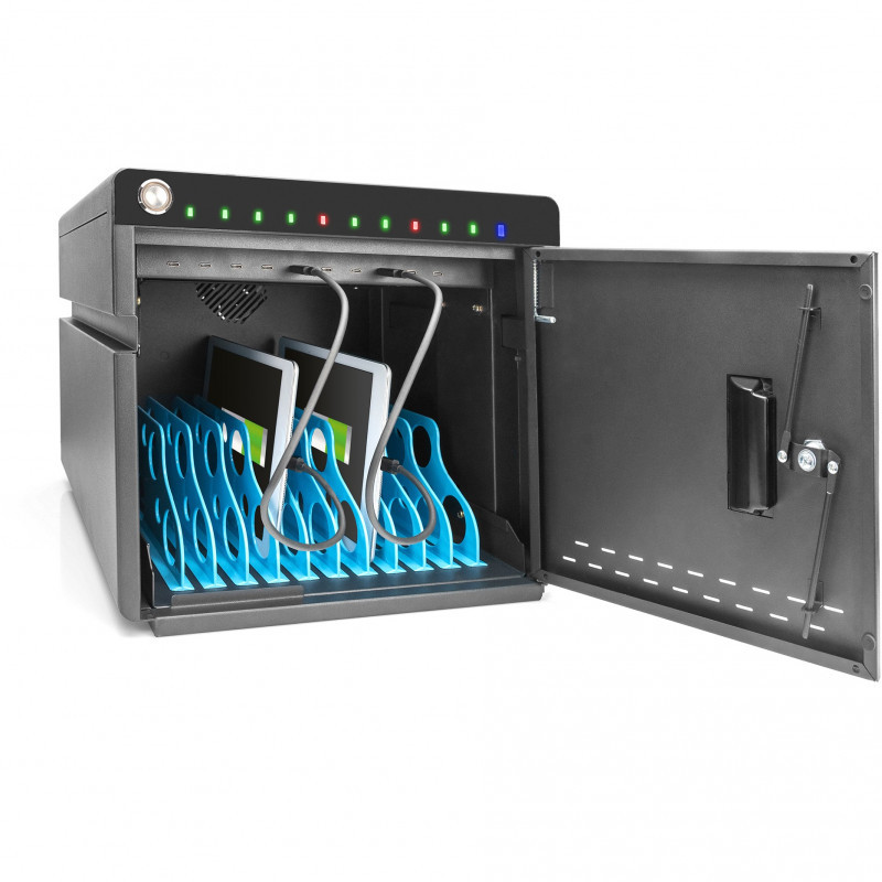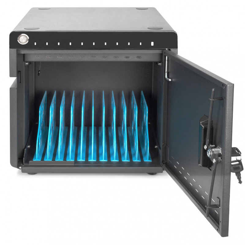 The mobile charging cabinet from DIGITUS® is the ideal and compact solution for storing and charging your portable devices such as notebooks and tablets. Mobile charging cabinets are frequently used in public facilities such as schools in order to store devices securely at a central location while charging them at the same time. The cabinet includes 10 charging stations, all of which have their own USB connection on the front. Thanks to the integrated LED indicators, you have an overview of the charging process at all times (red: charging in progress; green: charging complete/no device connected). Wear-proof pedestals ensure slip-free construction. An installed ventilators combined with ventilation slits ensures active cooling of the cabinet. Installed UV-C lamps ensure sterile conditions and thus environmentally friendly, enhanced hygiene."
