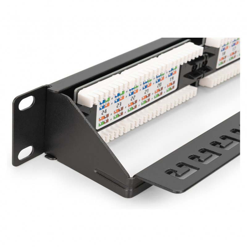 "Digitus CAT 6, class E patch panel, unshielded. Cabling technology: 10/100/1000Base-T(X), Connector(s): RJ-45, Connector contacts plating: Nickel. Mounting: Rack mounting, Rack capacity: 1U, Product colour: Black. Width: 485 mm, Height: 45 mm, Depth: 30 mm. Package width: 560 mm, Package depth: 80 mm, Package height: 100 mm"\n"Future-oriented standards and high-end quality for your network.