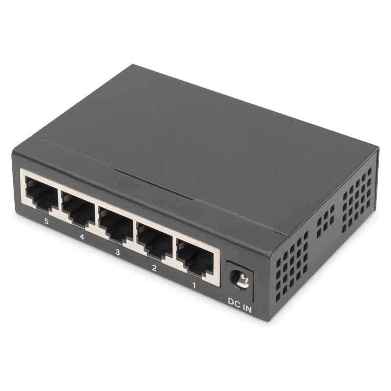 "Digitus 5 Port Gigabit Switch, Unmanaged. Switch type: Unmanaged. Basic switching RJ-45 Ethernet ports type: Gigabit Ethernet (10/100/1000), Basic switching RJ-45 Ethernet ports quantity: 5. Full duplex. MAC address table: 2000 entries, Switching capacity: 10 Gbit/s. Networking standards: IEEE 802.3, IEEE 802.3ab, IEEE 802.3az, IEEE 802.3u, IEEE 802.3x. DC input voltage: 5 V"\n"Fast and easy expansion of your network - Plug and Play