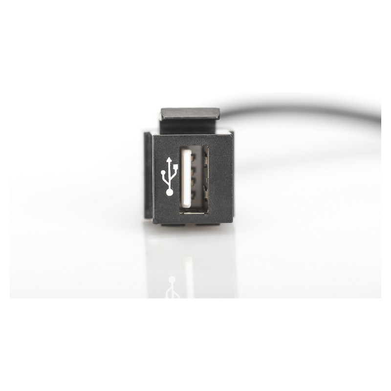 "Digitus USB 2.0 Keystone Module with 16 cm cable (Female/Male). Construction type: Flat, Product colour: Black, Connector 1: USB A. Quantity per pack: 1 pc(s). Country of origin: China"\n"USB 2.0 Keystone Jack,for DN-93832, 16 cm cable, black (RAL 9005)"