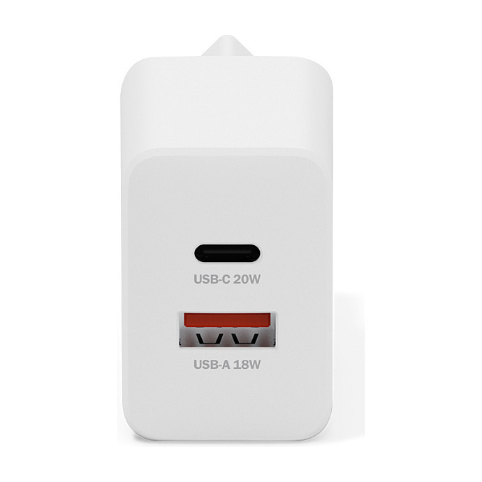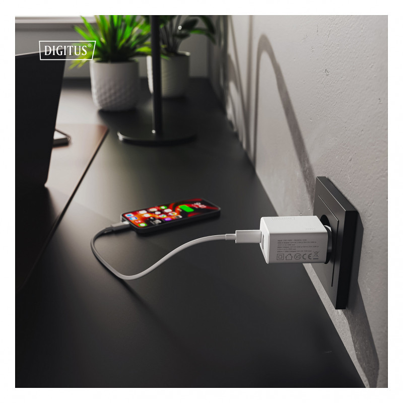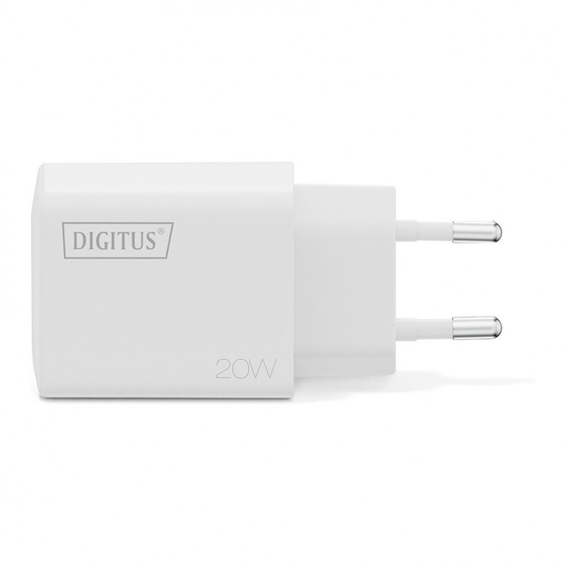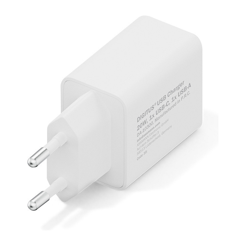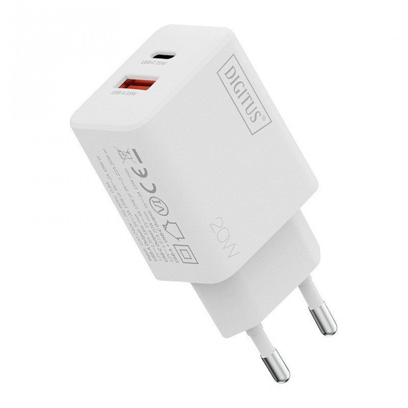 "Digitus USB Charger 20W, 1x USB-C, 1x USB-A. Charger type: Indoor, Power source type: AC, Charger compatibility: Universal. Input voltage: 100 - 240 V. USB Type-C ports quantity: 1, Fast charging, Power protection features: Over current, Overheating, Short circuit. Product colour: White"\n"20 W power for fast, safe charging of two devices simultaneously - compact, efficient and ideal for at home and on the go.