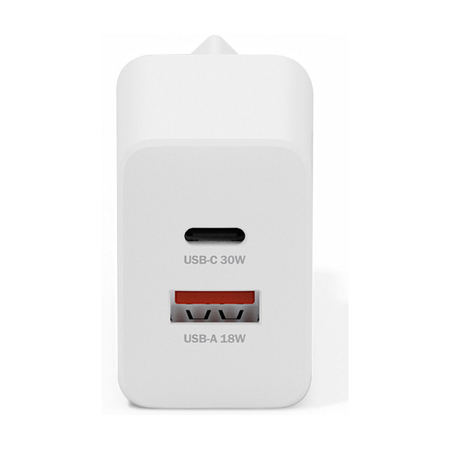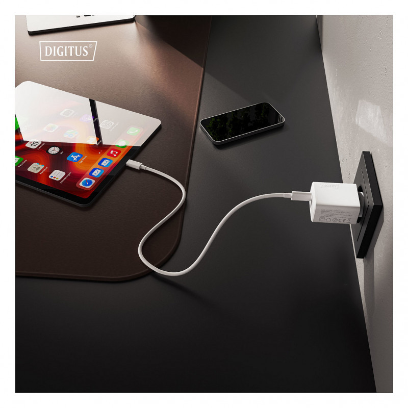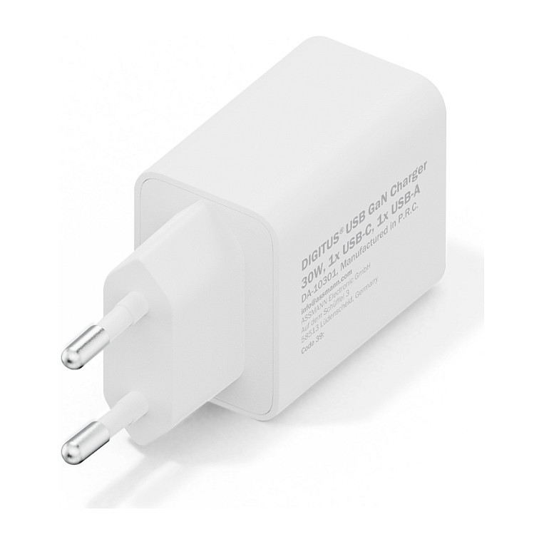 "Digitus USB GaN Charger 30W, 1x USB-C, 1x USB-A. Charger type: Indoor, Power source type: AC, Charger compatibility: Universal. Input voltage: 100 - 240 V. USB Type-C ports quantity: 1, Fast charging, Power protection features: Over current, Overheating, Short circuit. Product colour: White"\n"30 W output for even faster, reliable charging of up to two devices simultaneously - extra power, compact design and ideal for home, office and travel.