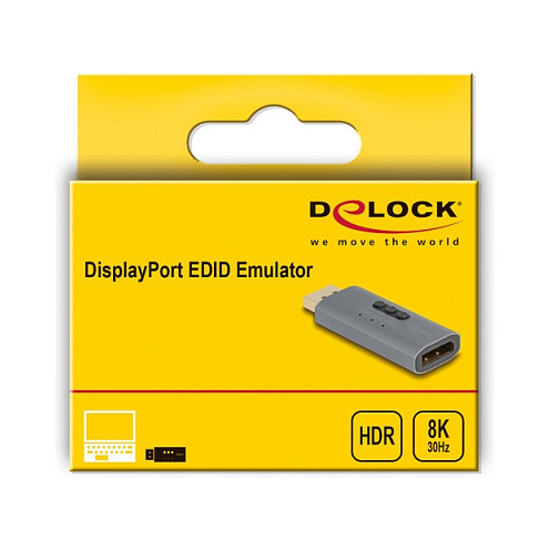 "DeLOCK 64328. Connector 1: DisplayPort, Connector 2: DisplayPort. Product colour: Anthracite"\n"This EDID Emulator by Delock emulates a monitor so that the signal source does not switch off the signal or change the resolution, even without a connected monitor. The adapter contains a standard set of EDID/DDC data, but it can also read and save the data of a connected monitor.