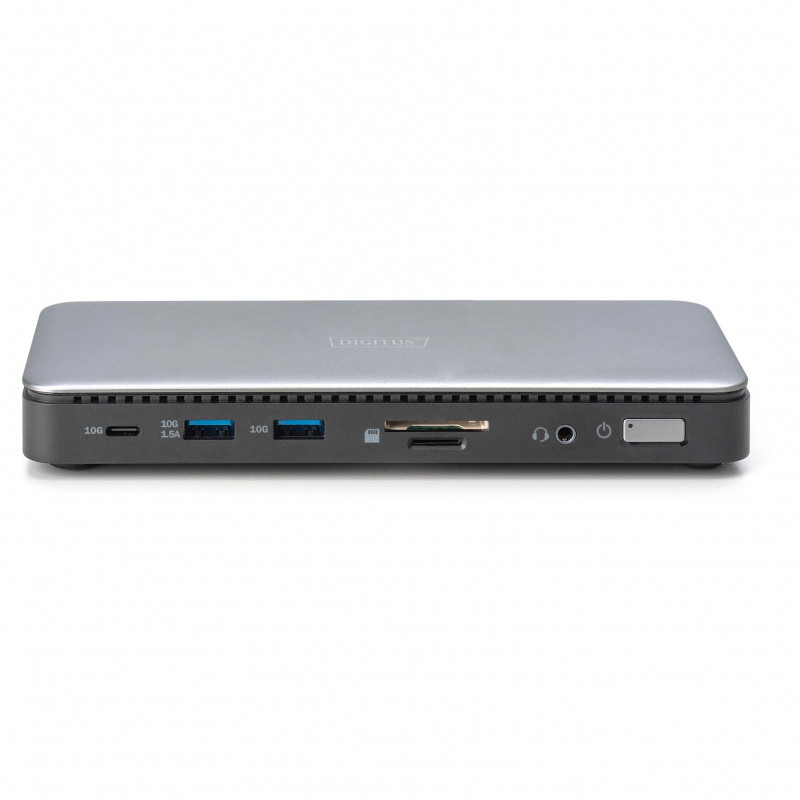 "Digitus USB-C docking station, 11-port. Connectivity technology: Wired, Host interface: USB 3.2 Gen 2 (3.1 Gen 2) Type-C, HDCP version: 1.4/2.2. Ethernet LAN data rates: 10,100,1000 Mbit/s. Product colour: Black, Grey, Compatible memory cards: MicroSD (TransFlash), SD, Data transfer rate: 10 Gbit/s. Power source type: DC, Power consumption (max): 150 W, Power cable length: 1 m. Mobile operating systems supported: Android, iOS, Other operating systems supported: ChromeOS"\n"Our docking station offers an ideal solution for office applications - expand your notebook connections and benefit from the triple monitor function, fast data transfer and a wide range of connection options