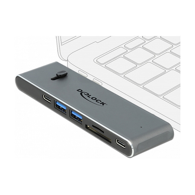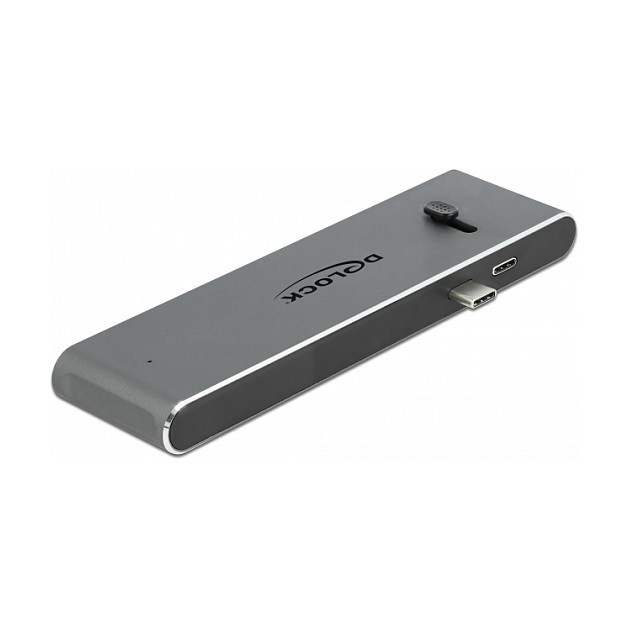"DeLOCK Docking Station Dual USB Type-C with HDMI / USB 3.2 / SD / PD 3.0. Connectivity technology: Wired, Host interface: USB 3.2 Gen 1 (3.1 Gen 1) Type-C. Product colour: Grey, Compatible memory cards: MicroSD (TransFlash), SD, Maximum digital resolution: 3840 x 2160 pixels. Power source type: USB. Windows operating systems supported: Windows 10, Windows 7, Windows 8.1, Mac operating systems supported: Mac OS X 10.15 Catalina, Other operating systems supported: Android. Width: 35 mm, Depth: 125 mm, Height: 12 mm"\n"This docking station by Delock can be connected to a MacBook with two adjacent Thunderbolt™ 3 ports, e.g. the MacBook Pro. It is also possible to insert one of the two USB-C™ plugs into the housing, so that the docking station can also be connected to other devices such as a smartphone, tablet or laptop. One monitor with 4K 30 Hz can be operated at the HDMI output port. One built-in USB Type-C™ port and two USB Type-A ports allows the use of peripherals.