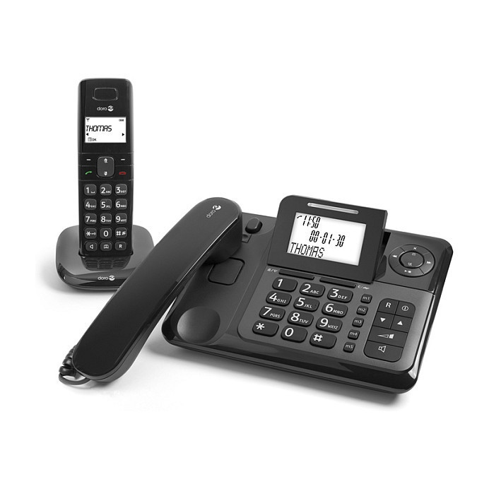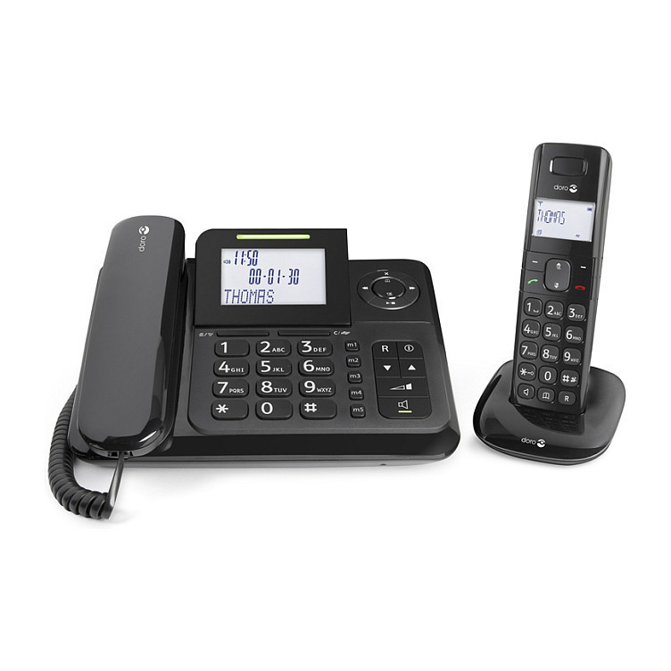 "Doro Comfort 4005. Type: Analog/DECT telephone. Speakerphone, Phonebook capacity: 50 entries. Caller ID. Product colour: Black. Number of handsets included: 2"\n"The easy to use Doro Comfort 4005 is the perfect match when you want both cordless and corded phones that work and look great together. With the DECT base unit incorporated in the corded phone, this solution offers a conveniently smaller charging cradle for your cordless handset than is normally required. Both handsets are comfortable to hold and offer good, clear sound thanks to Doro TrueSound quality, and the corded phone has a boost button for anyone who may need even louder sound. Other features include easy to read white backlit display, answering machine, speakerphone, intercom and call transfer between handsets, and more.