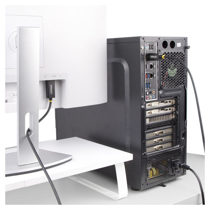 Integrated video adapter cable reduces points of failure, signal loss and clutter, and requires no additional power. Built with adaptive receiver equalization to optimize the input signal and amplify the output signal, to ensure display compatibility. Cage shielding prevents Electromagnetic Interference (EMI) and helps maintain signal integrity. This Active Adapter Cable works with computers from Dell, HP, Lenovo, and other desktop manufacturers. It is backward compatible with 4K 30Hz, 1080p, and other lower resolutions.