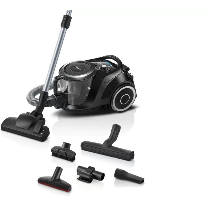 "Bosch Serie 6 BGC41XSIL. Maximum input power: 700 W. Type: Cylinder vacuum, Cleaning type: Dry, Dust container type: Bagless, Dust capacity: 2.4 L. Vacuum air filtering: Allergy filter, Dirt separating method: Filtering, Noise level: 68 dB. Product colour: Black"\n