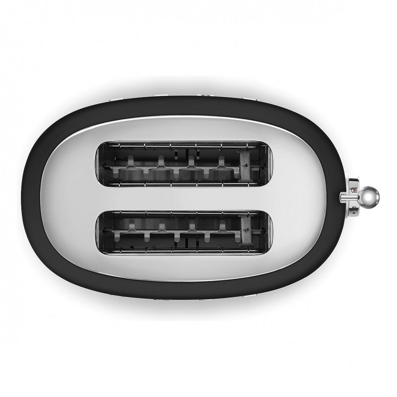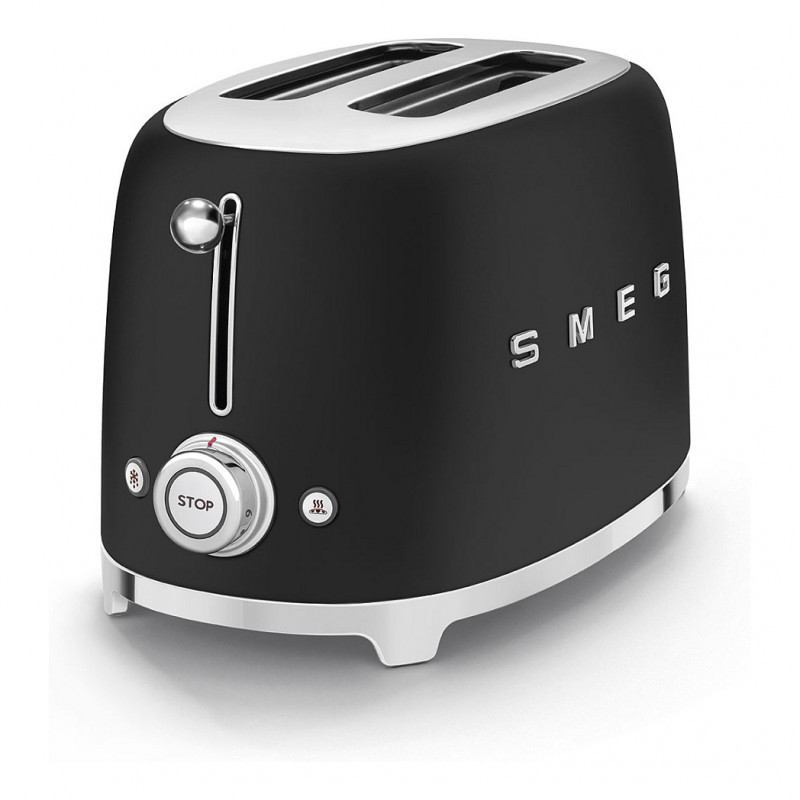 "Smeg 50's Style Toaster TSF01BLMEU Black. Number of slices: 2 slice(s), Product colour: Black, Stainless steel, Housing material: Plastic, Stainless steel. Power: 950 W, AC input voltage: 220-240 V, AC input frequency: 50-60 Hz. Cord length: 1 m, Width: 195 mm, Depth: 310 mm. Country of origin: China. Products per intermodal container (20ft): 1200 pc(s), Products per intermodal container (40ft): 2448 pc(s), Products per intermodal container (40ft, HC): 3060 pc(s)"\n"Smeg's iconic retro design offers a pop of colour and a premium enamelled finish. Whether you're preparing breakfast before the school run, or a luxurious breakfast in bed, the Smeg TSF01 two slot toaster has got it covered. This two slice toaster is perfect those who like to make a statement in the kitchen, but can also handle warming pastries, bagels, and toasting treats!