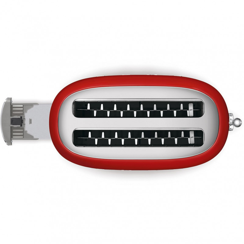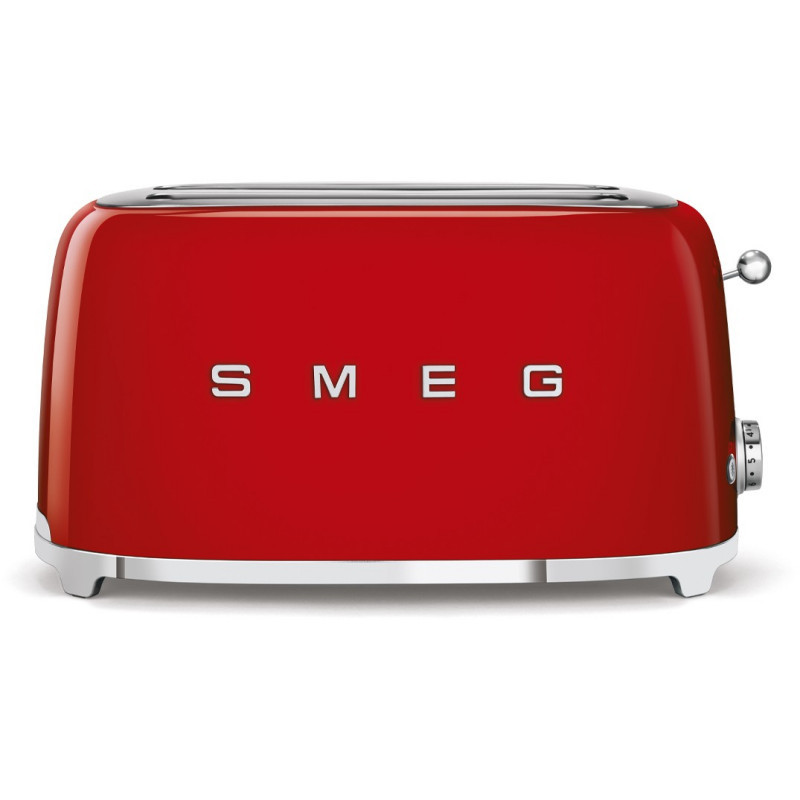 "Smeg 50's Style Toaster TSF02RDEU Red. Number of slices: 4 slice(s), Product colour: Red, Housing material: Steel. Power: 1500 W, AC input voltage: 220 - 240 V, AC input frequency: 50-60 Hz. Cord length: 1 m, Width: 394 mm, Depth: 208 mm. Country of origin: China. Pallet gross weight: 260.2 kg, Layers per pallet: 7 pc(s), Products per pallet layer: 7 pc(s)"\n"Smeg's iconic retro design offers a pop of colour and a premium enamelled finish. Smeg's TSF02 features two long extra wide bread slots which can accommodate a variety of bread thicknesses including toasting baguettes, thick farmhouse loafs and artisan breads. Each slot features a self-centering rack to ensure even toasting and once the selected toasting time has finished, the slices pop up automatically.