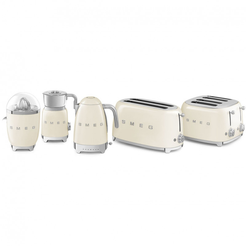 "Smeg 50's Style Toaster TSF03CREU Cream. Number of slices: 4 slice(s), Product colour: Cream, Housing material: Steel. Power: 2000 W, AC input voltage: 220 - 240 V, AC input frequency: 50 - 60 Hz. Cord length: 1 m, Width: 300 mm, Depth: 330 mm. Country of origin: China. Pallet gross weight: 256 kg, Layers per pallet: 7 pc(s), Products per pallet layer: 6 pc(s)"\n"Smeg's iconic retro design offers a pop of colour and a premium enamelled finish. Whether your preparing fragrant, buttery croissants for two, or a family sized breakfast before the school run, the Smeg TSF03 4 slot toaster has got it covered. This toaster allows up to 4 slices to be cooked at the same time making it ideal for large families, or those who like the start the day with a hearty breakfast for plenty of energy!