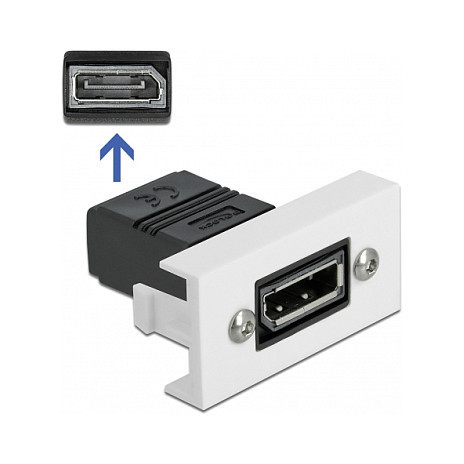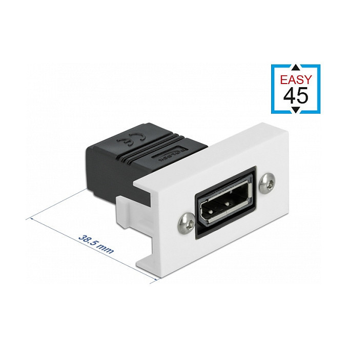 "DeLOCK Easy 45 DisplayPort Module straight 22.5 x 45 mm. Product colour: Black. Width: 45 mm, Depth: 22.5 mm, Height: 38.5 mm"\n"This Easy 45 module by Delock is designed to provide a DisplayPort female port. The simple snap-in mechanism ensures that the module is firmly in place and can be easily removed if necessary.